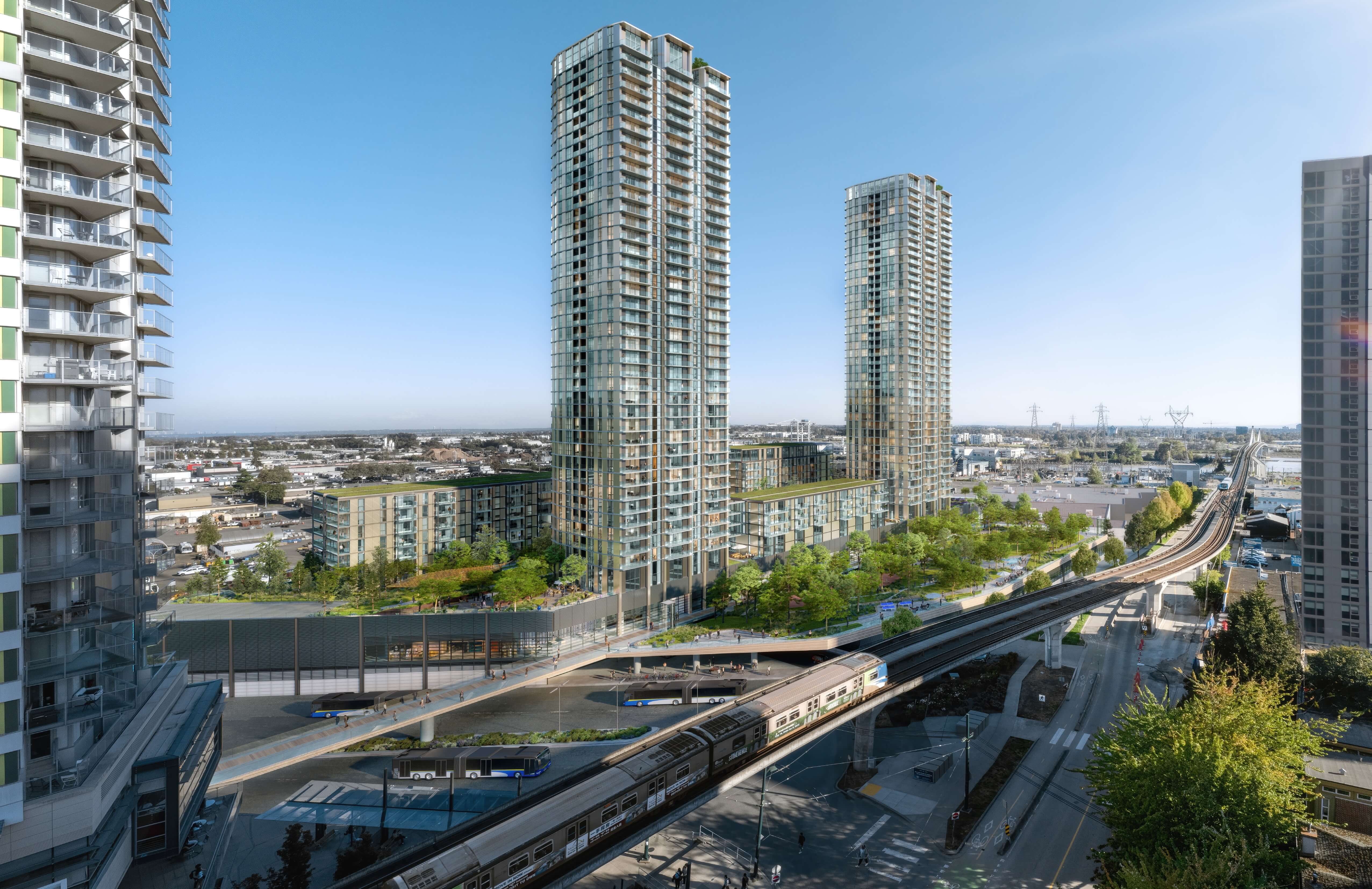 The site is located immediately adjacent to the existing Marine Gateway mixed-use centre, Canada Line station, and South Vancouver Bus Loop station.